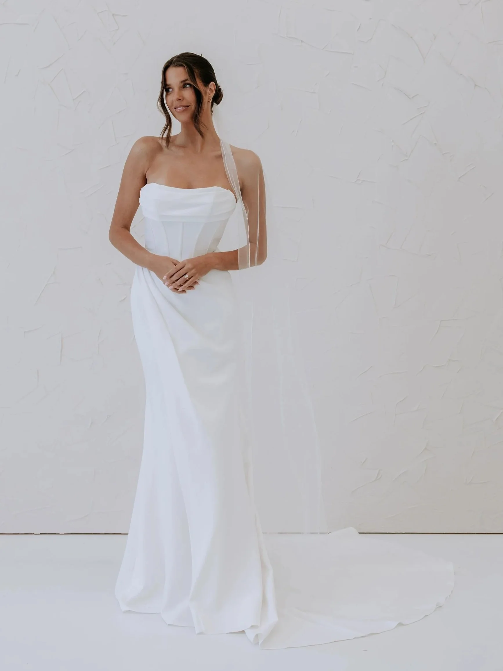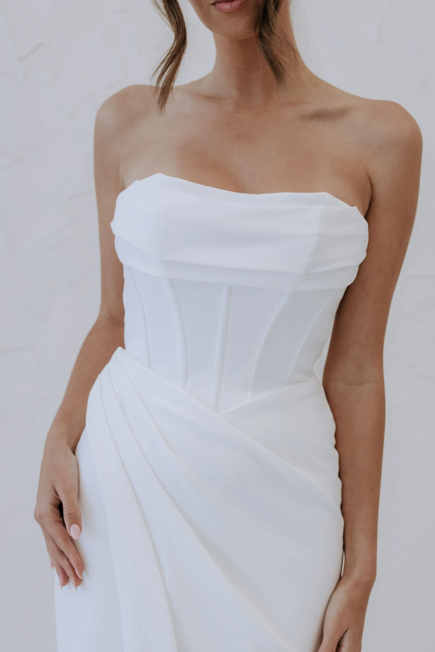 THE ESSENCE OF ROMANCE & ELEGANCE. CRAFTED FROM LUXURIOUS CREPE, IT FEATURES A STRIKING MODERN NECKLINE & FIT & FLARE SILHOUETTE THAT ACCENTUATES YOUR WAIST AND CURVES. A DELICATE BASQUE WAIST ADDS A TOUCH OF SOPHISTICATION, LEADING TO A DRAPED SKIRT THAT FLOWS ELEGANTLY WITH EACH STEP. WITH ITS CRISP LINES & FEMININE ALLURE, ARIA IS A TIMELESS CELEBRATION OF LOVE.