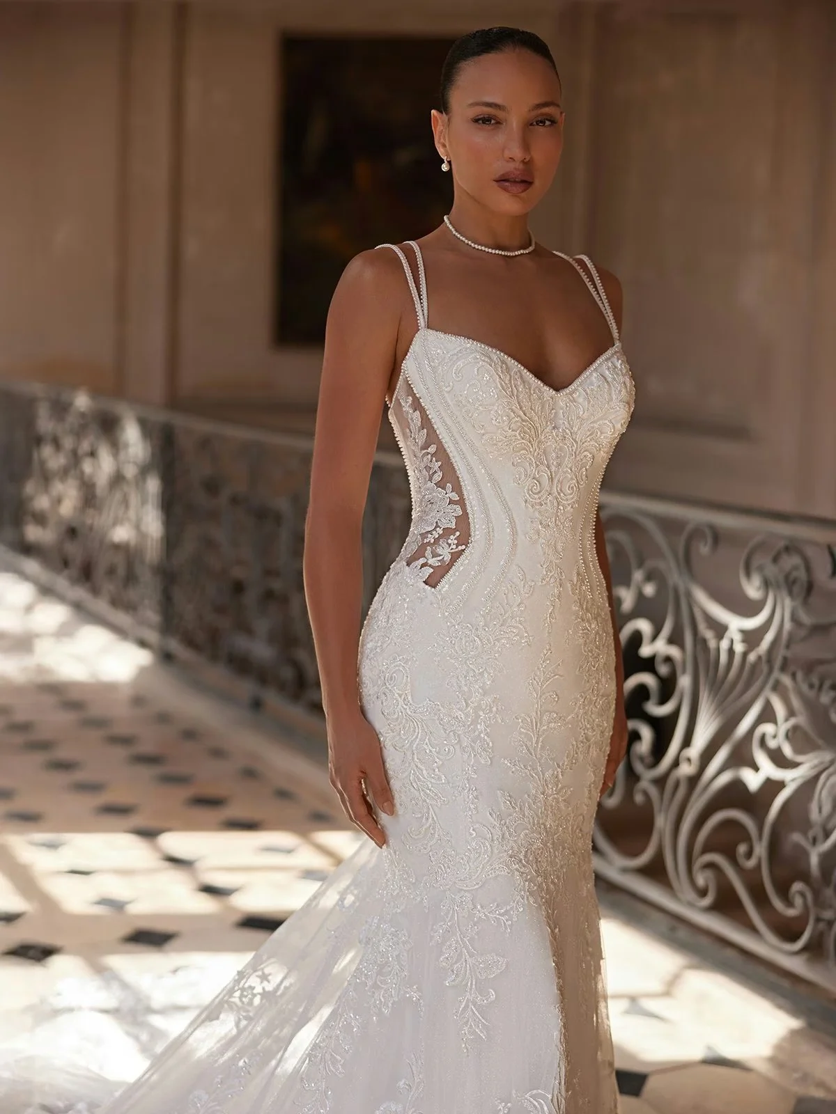 THE SWEETHEART NECKLINE IS FRAMED BY BEADED LACE STRAPS LEADING INTO AN ALLURING OPEN BACK. THE ILLUSION BODICE CUTOUTS ENHANCE YOUR SILHOUETTE WITH A TOUCH OF MODERN ELEGANCE. INTRICATE LACE EMBELLISHED WITH METICULOUSLY PLACED BEADING & PEARLS.