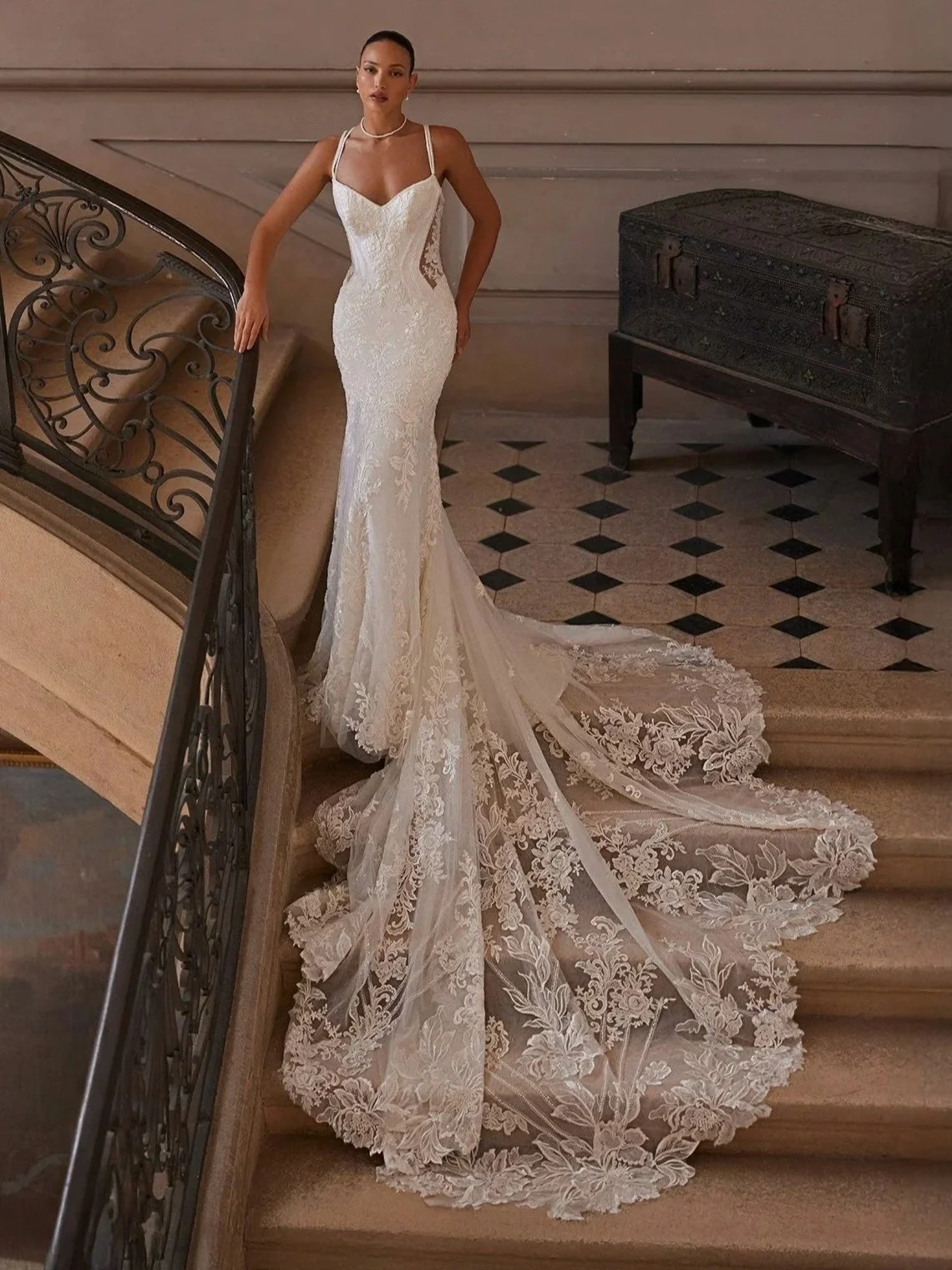 A SENSATIONAL MERMAID SILHOUETTE THAT EXUDES GRANDURE & GLAMOUR. CRAFTED IN LAYERS OF SOFT TULLE & SPARKLE TULLE THIS ROMANTIC SILHOUETTE HUGS THE BODY BEFORE GENTLY SWEEPING INTO A CATHEDRAL SCALLOPED TRAIN.